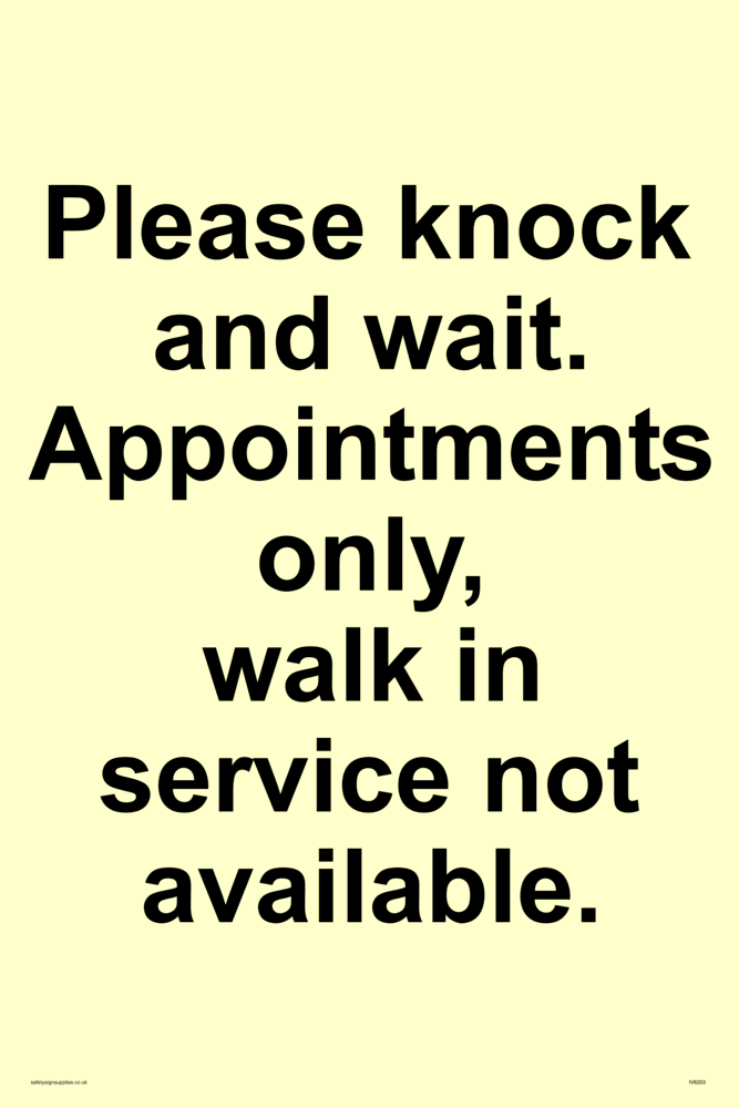 Please knock and wait. Appointments only, walk in service not available. Sign