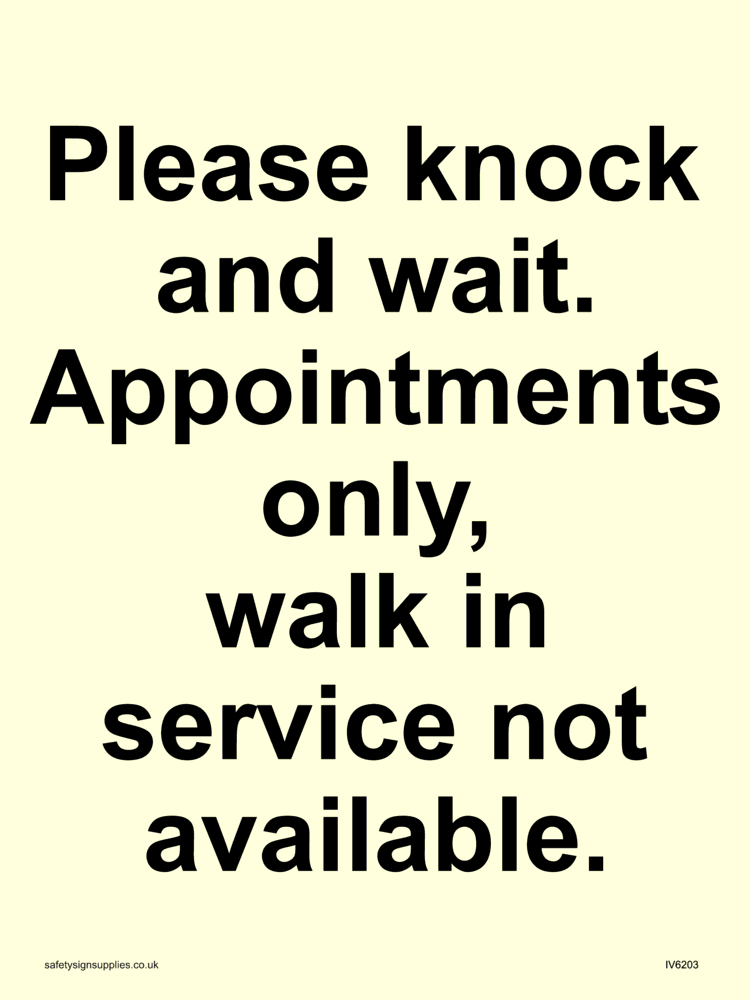 Please knock and wait. Appointments only, walk in service not available. Sign
