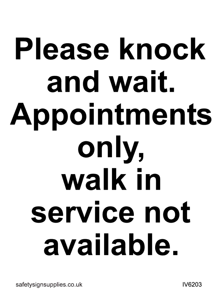 Please knock and wait. Appointments only, walk in service not available. Sign