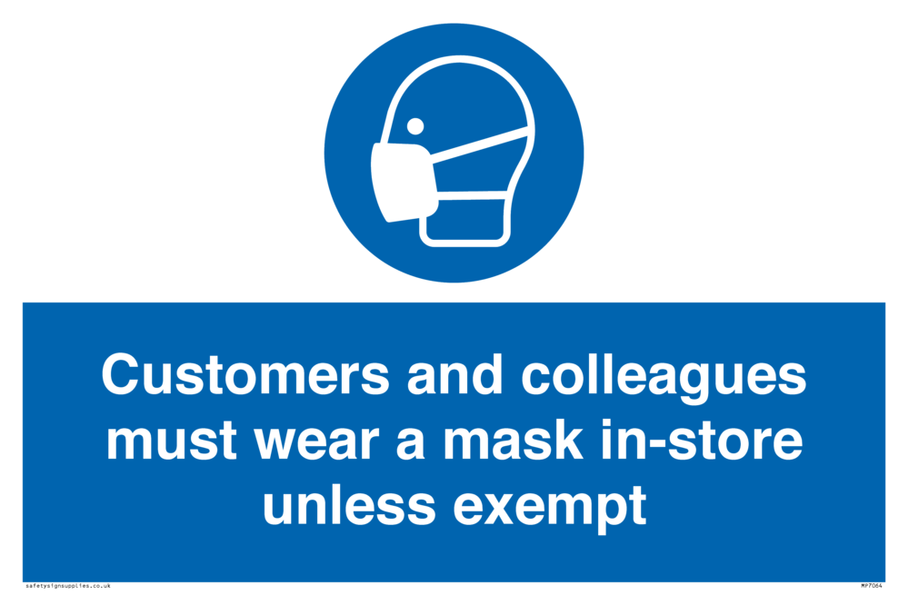 Customers and colleagues must wear a mask in-store unless exempt Sign