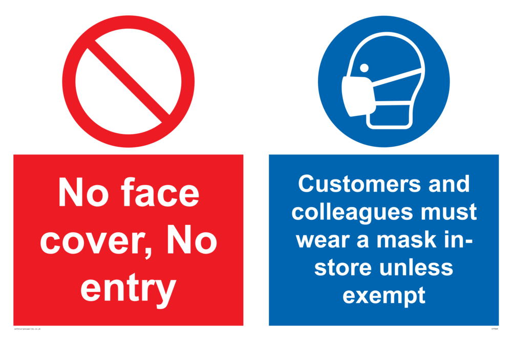No face cover, no entry. Customers and colleagues must wear a mask in-store unless exempt. Sign