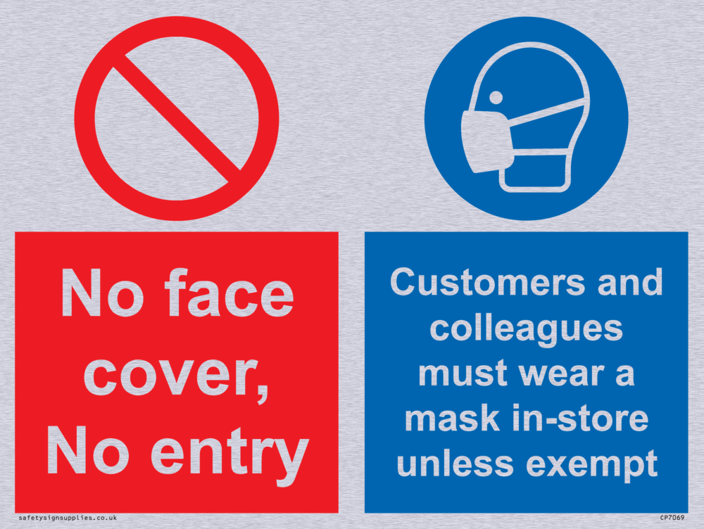 No face cover, no entry. Customers and colleagues must wear a mask in-store unless exempt. Sign