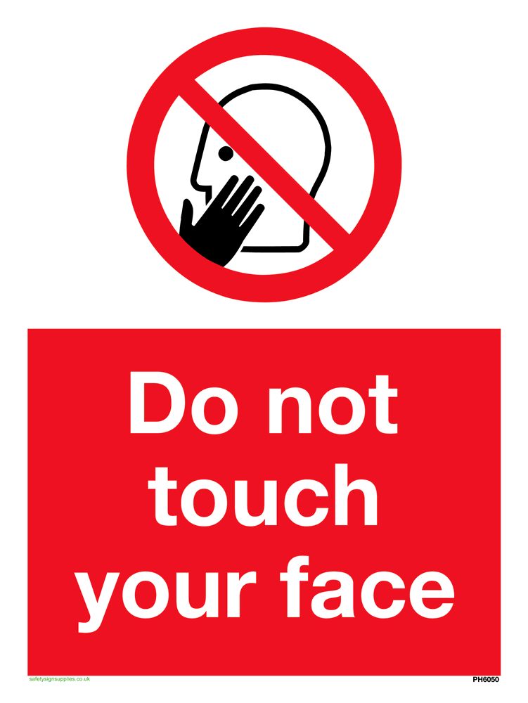 This sign contains a do not touch symbol - hand in black with red prohibition circle crossed through with diagonal line.