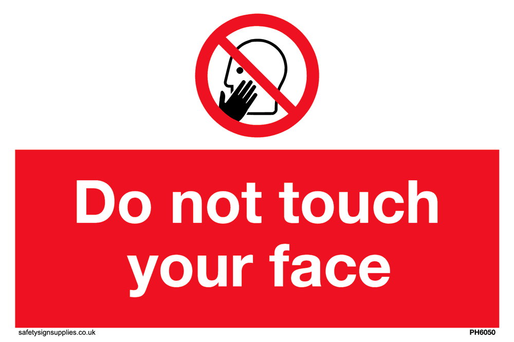 This sign contains a do not touch symbol - hand in black with red prohibition circle crossed through with diagonal line.