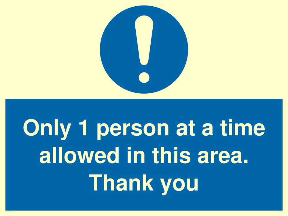 Sign Text: Only 1 person at a time allowed in this area. Thank you