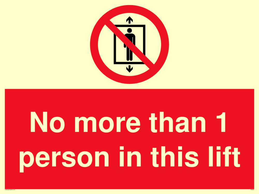 This sign contains a do not use lift symbol. Lift in black within red circle with diagonal line crossed through.