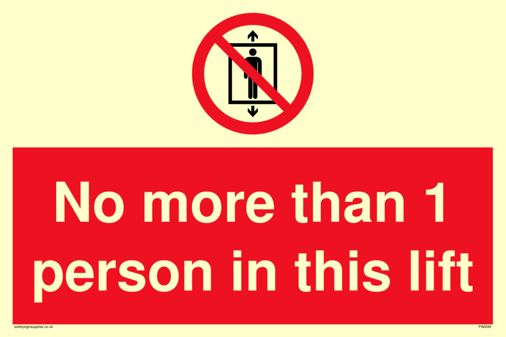 This sign contains a do not use lift symbol. Lift in black within red circle with diagonal line crossed through.