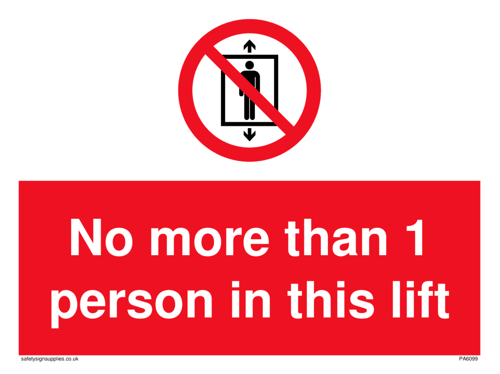 This sign contains a do not use lift symbol. Lift in black within red circle with diagonal line crossed through.