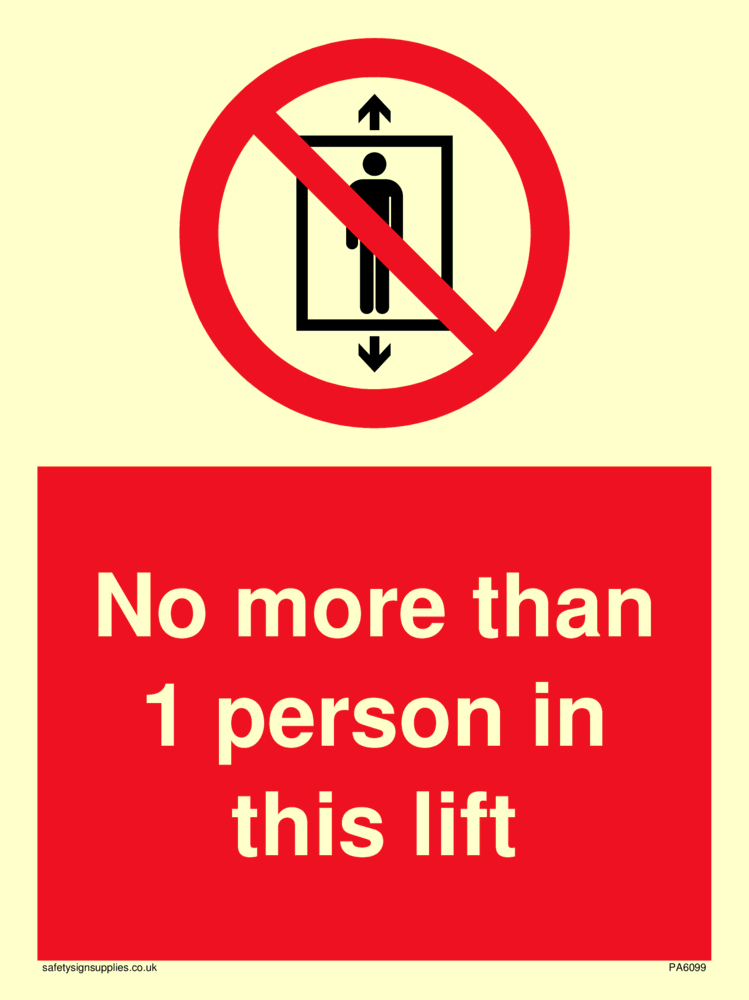 This sign contains a do not use lift symbol. Lift in black within red circle with diagonal line crossed through.