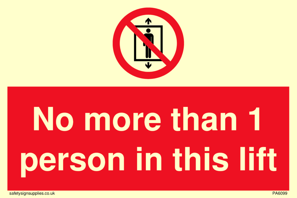 This sign contains a do not use lift symbol. Lift in black within red circle with diagonal line crossed through.