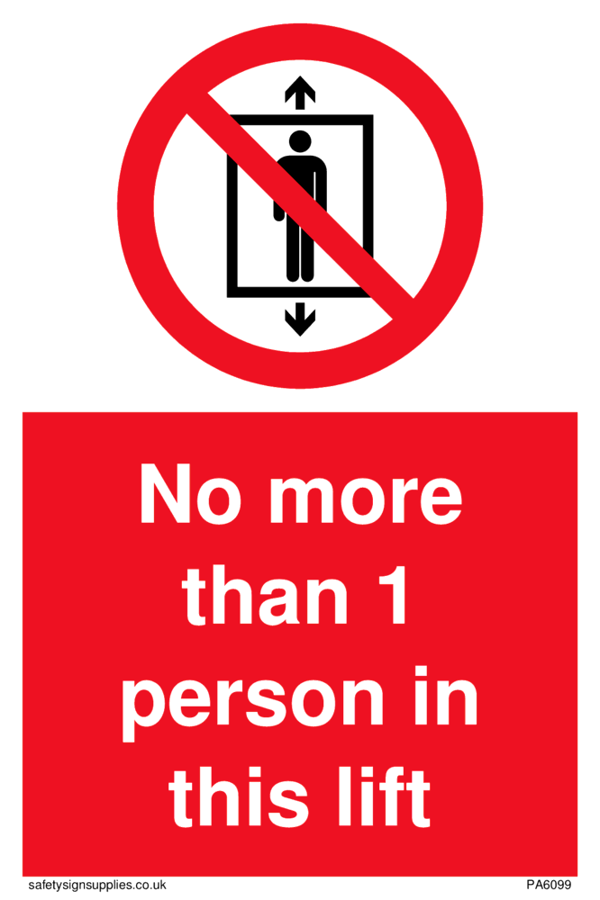 This sign contains a do not use lift symbol. Lift in black within red circle with diagonal line crossed through.