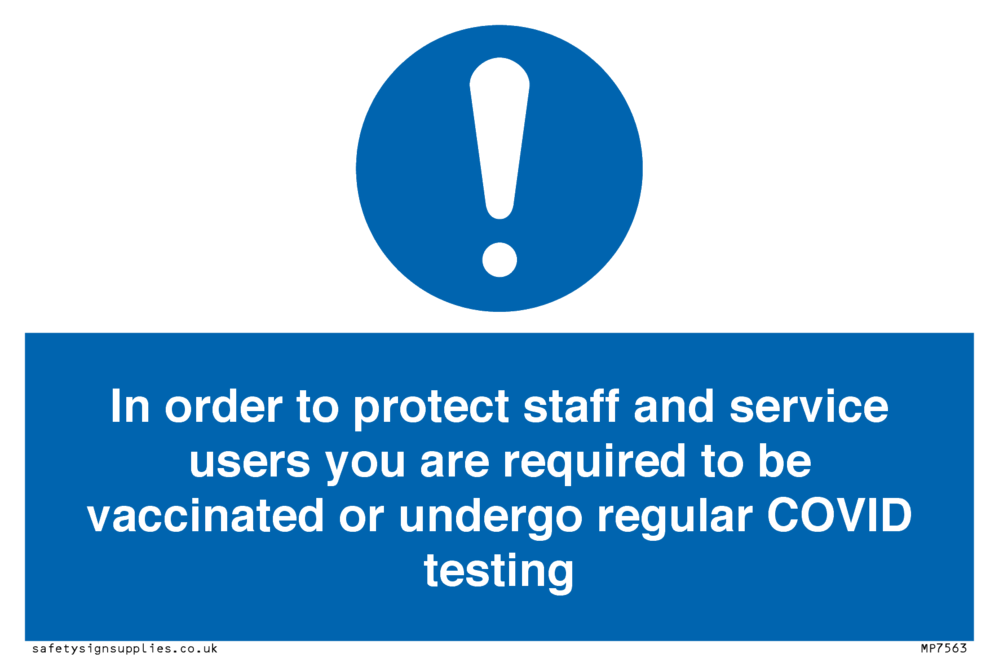 Sign Text: In order to protect staff and service users you are required to be vaccinated or undergo regular COVID testing