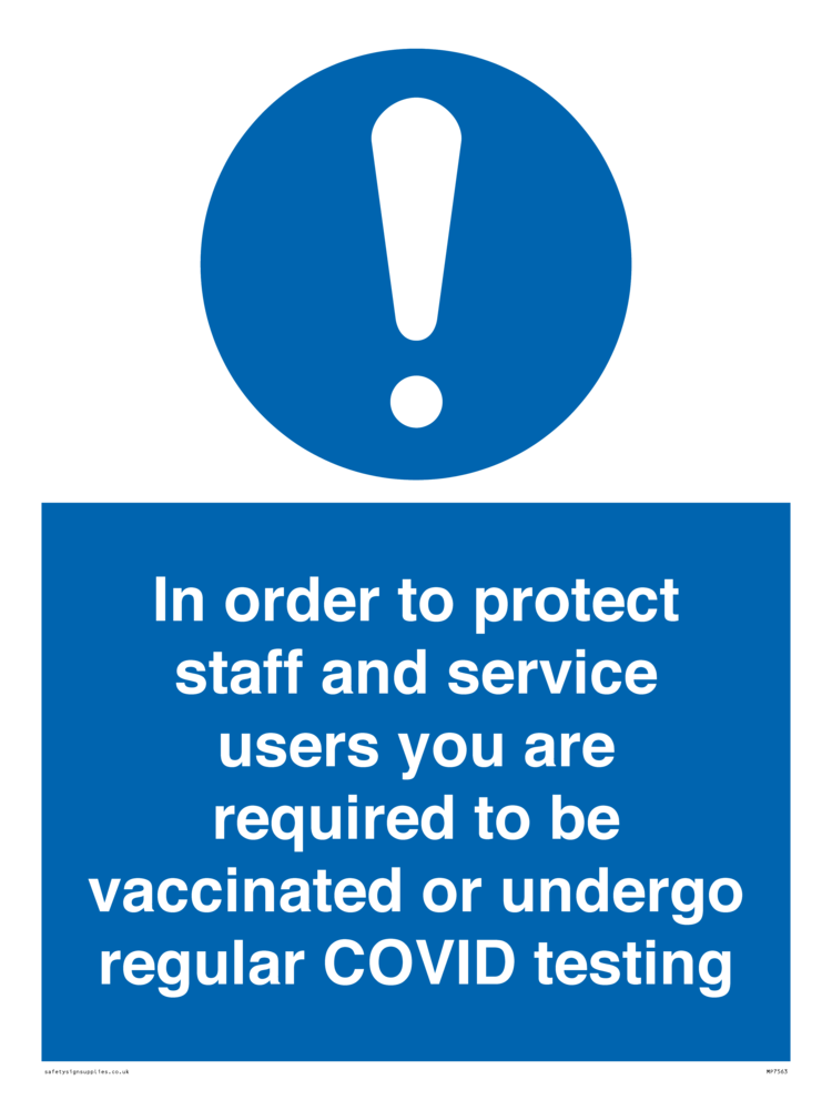 In order to protect staff and service users you are required to be vaccinated or undergo regular COVID testing Sign
