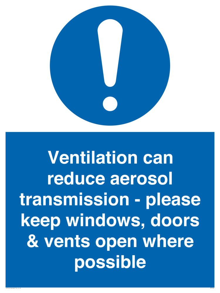 Sign Text: Ventilation can reduce aerosol transmission - please keep windows, doors & vents open where possible