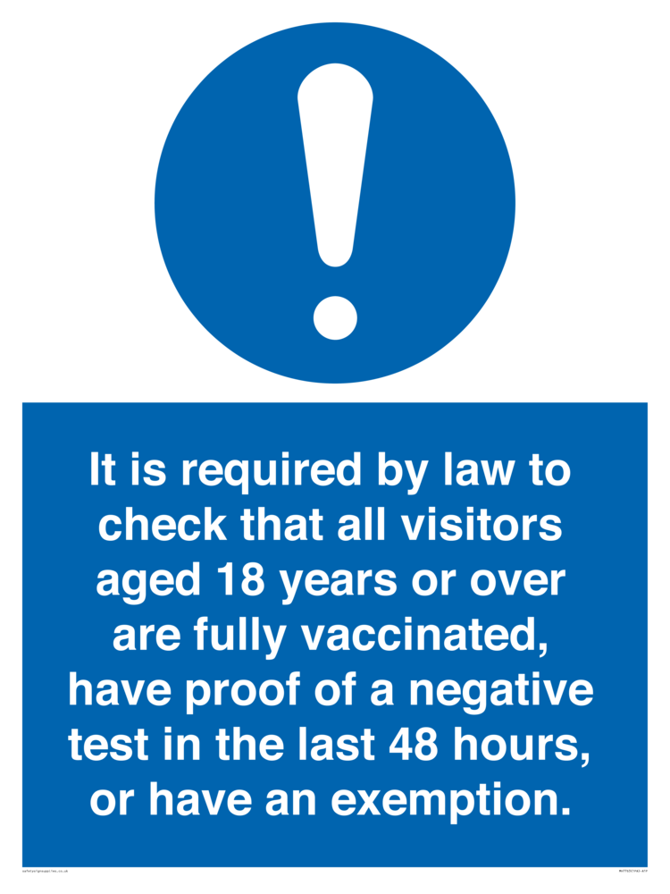 It is required by law to check that all visitors aged 18 years or over are fully vaccinated, have proof of a negative test in the last 48 hours, or have an exemption. Sign