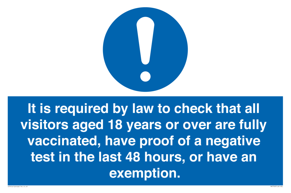It is required by law to check that all visitors aged 18 years or over are fully vaccinated, have proof of a negative test in the last 48 hours, or have an exemption. Sign