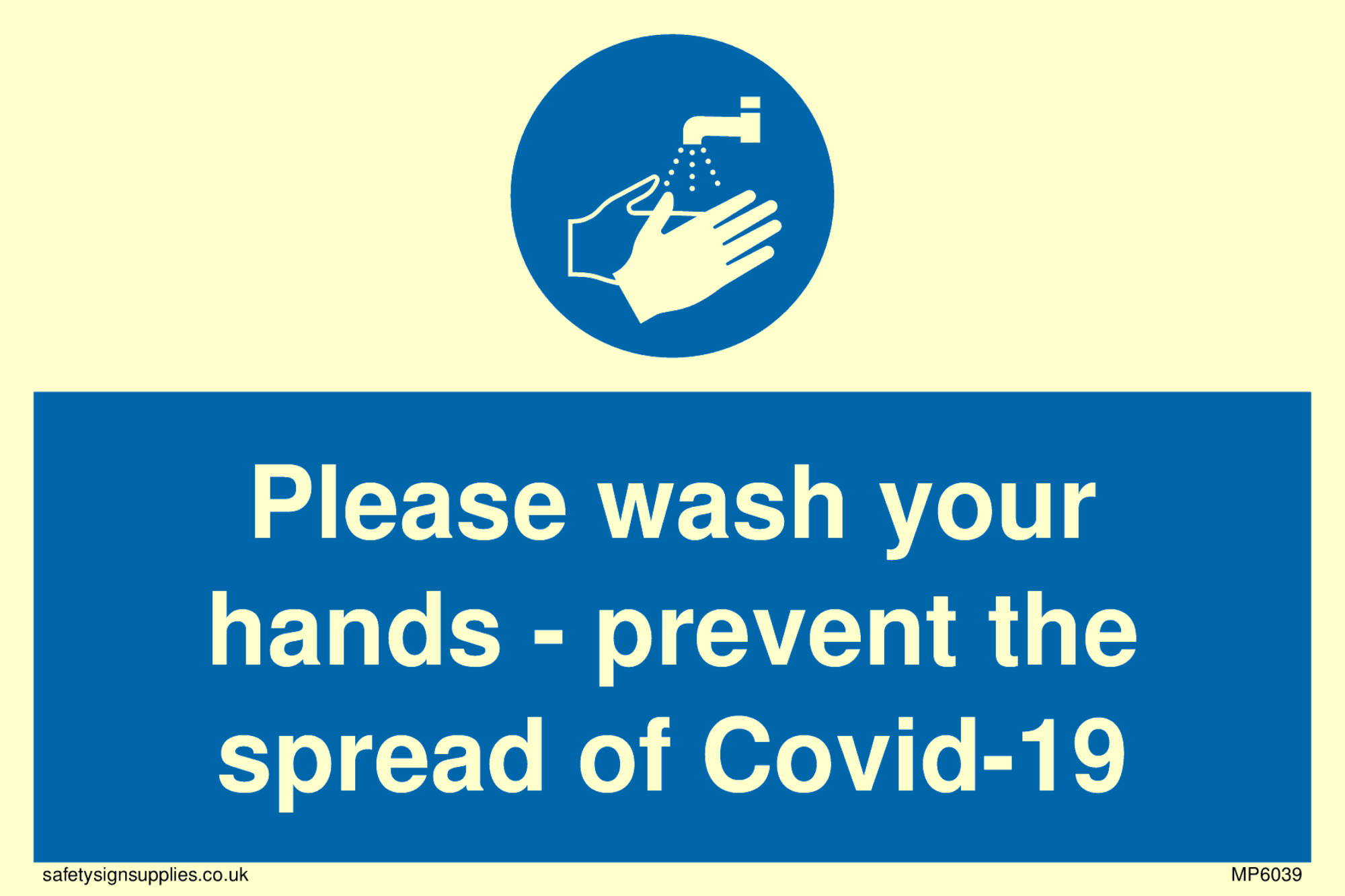 This sign contains a wash hands symbol - person washing hands under running tap in white within blue circle.