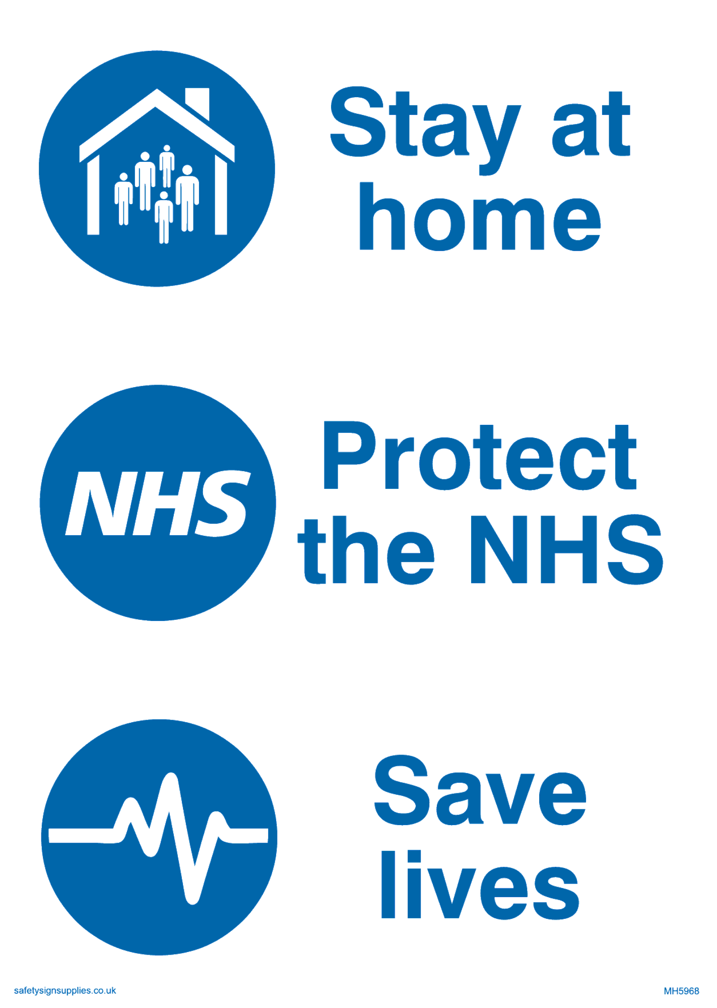 Sign Text: Stay at home. Protect the NHS. Save lives.