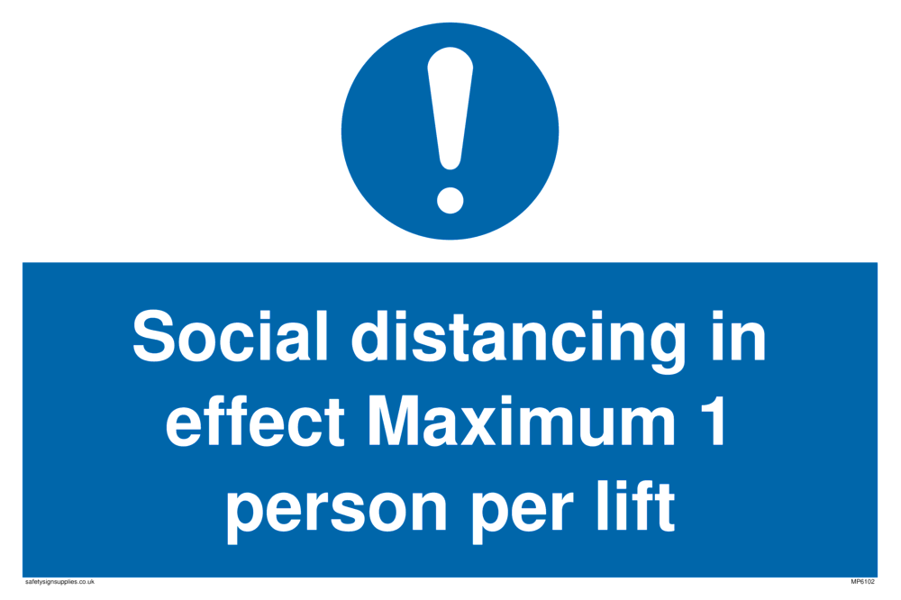 This sign contains a general Mandatory Exclamation Symbol - exclamation mark in white on blue circle background.