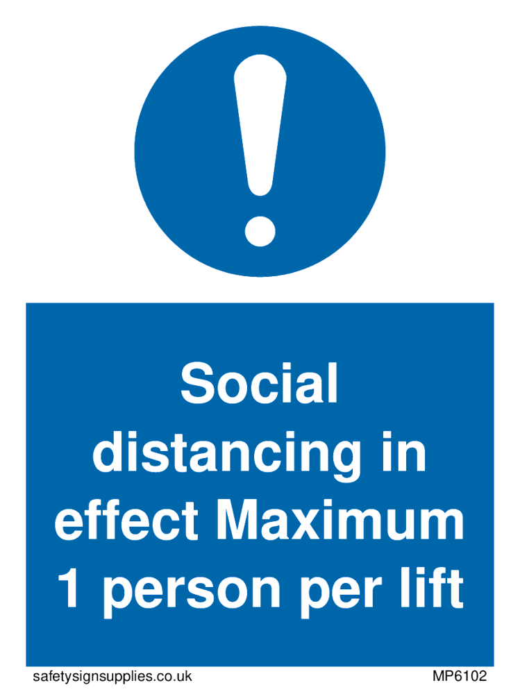 This sign contains a general Mandatory Exclamation Symbol - exclamation mark in white on blue circle background.