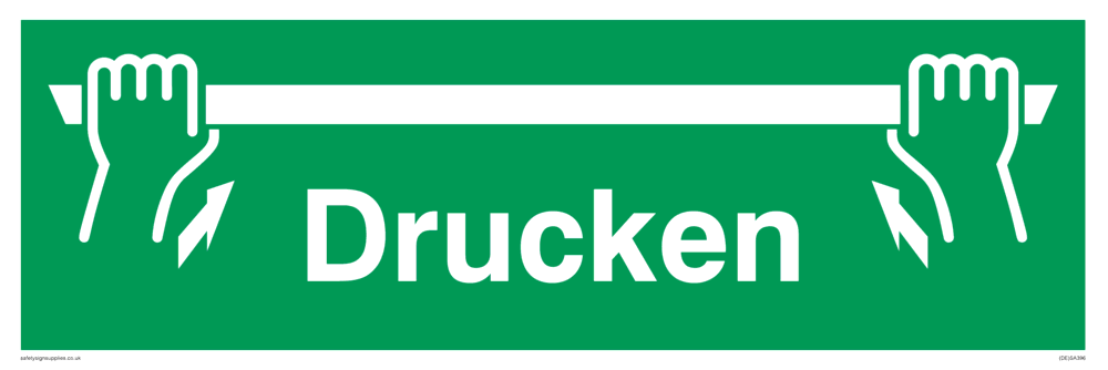 This sign contains a push /pull to open symbol - hand pushing or pulling bar with arrow in white on green background.