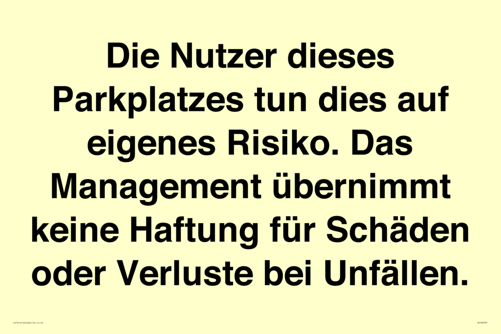 Sign Text: Die Nutzer dieses Parkplatzes tun dies auf eigenes Risiko. Das Management übernimmt keine Haftung für Schäden oder Verluste bei Unfällen.