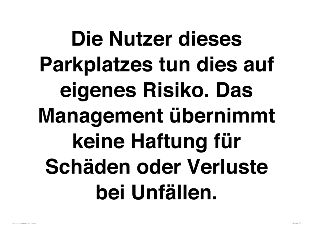 Sign Text: Die Nutzer dieses Parkplatzes tun dies auf eigenes Risiko. Das Management übernimmt keine Haftung für Schäden oder Verluste bei Unfällen.