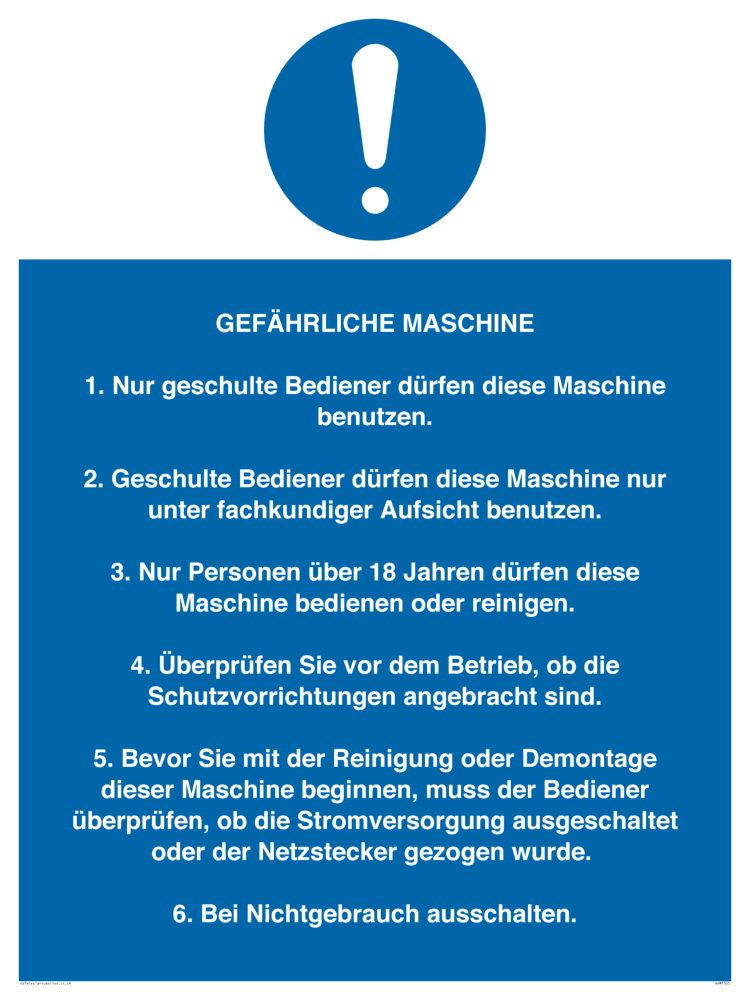 Sign Text: GEFÄHRLICHE MASCHINE 1. Nur geschulte Bediener dürfen diese Maschine benutzen. 2. Geschulte Bediener dürfen diese Maschine nur unter fachkundiger Aufsicht benutzen. 3. Nur Personen über 18 Jahren dürfen diese Maschine bedienen oder reinigen. 4. Überprüfen Sie vor dem Betrieb, ob die Schutzvorrichtungen angebracht sind. 5. Bevor Sie mit der Reinigung oder Demontage dieser Maschine beginnen, muss der Bediener überprüfen, ob die Stromversorgung ausgeschaltet oder der Netzstecker gezogen wurde. 6. Bei Nichtgebrauch ausschalten