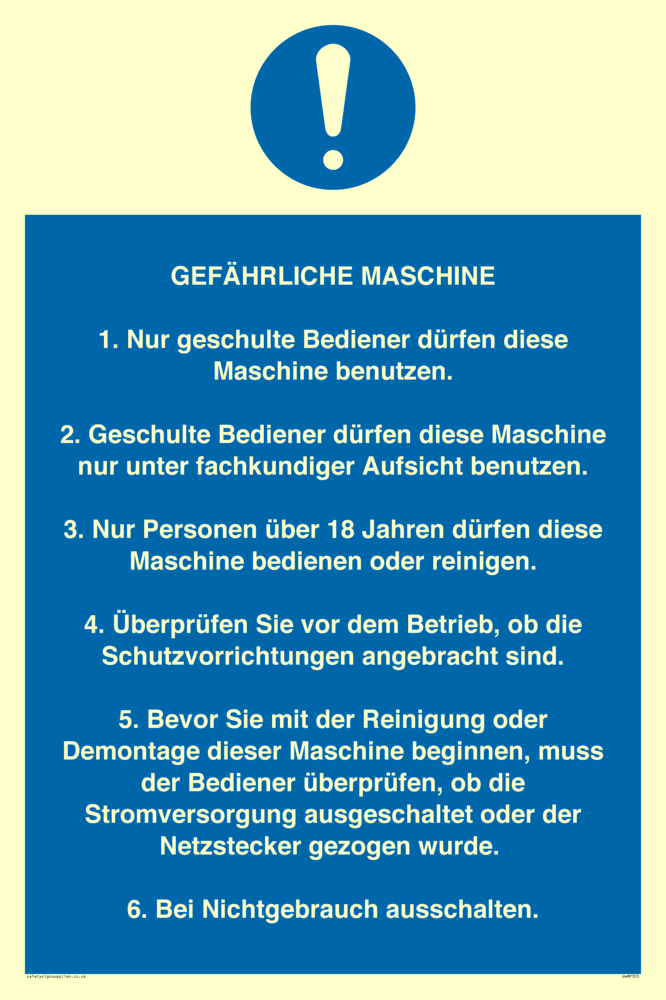 Sign Text: GEFÄHRLICHE MASCHINE 1. Nur geschulte Bediener dürfen diese Maschine benutzen. 2. Geschulte Bediener dürfen diese Maschine nur unter fachkundiger Aufsicht benutzen. 3. Nur Personen über 18 Jahren dürfen diese Maschine bedienen oder reinigen. 4. Überprüfen Sie vor dem Betrieb, ob die Schutzvorrichtungen angebracht sind. 5. Bevor Sie mit der Reinigung oder Demontage dieser Maschine beginnen, muss der Bediener überprüfen, ob die Stromversorgung ausgeschaltet oder der Netzstecker gezogen wurde. 6. Bei Nichtgebrauch ausschalten