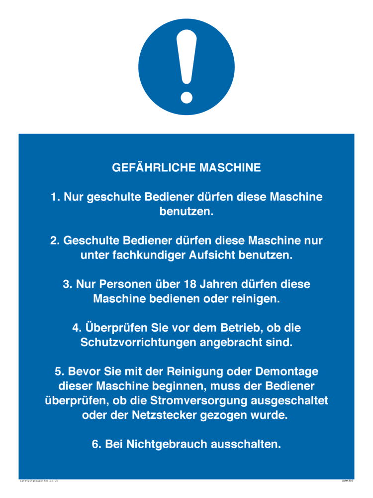 Sign Text: GEFÄHRLICHE MASCHINE 1. Nur geschulte Bediener dürfen diese Maschine benutzen. 2. Geschulte Bediener dürfen diese Maschine nur unter fachkundiger Aufsicht benutzen. 3. Nur Personen über 18 Jahren dürfen diese Maschine bedienen oder reinigen. 4. Überprüfen Sie vor dem Betrieb, ob die Schutzvorrichtungen angebracht sind. 5. Bevor Sie mit der Reinigung oder Demontage dieser Maschine beginnen, muss der Bediener überprüfen, ob die Stromversorgung ausgeschaltet oder der Netzstecker gezogen wurde. 6. Bei Nichtgebrauch ausschalten