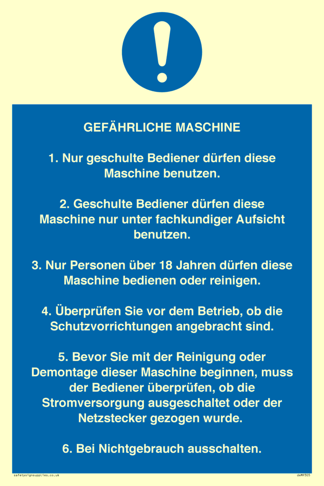 Sign Text: GEFÄHRLICHE MASCHINE 1. Nur geschulte Bediener dürfen diese Maschine benutzen. 2. Geschulte Bediener dürfen diese Maschine nur unter fachkundiger Aufsicht benutzen. 3. Nur Personen über 18 Jahren dürfen diese Maschine bedienen oder reinigen. 4. Überprüfen Sie vor dem Betrieb, ob die Schutzvorrichtungen angebracht sind. 5. Bevor Sie mit der Reinigung oder Demontage dieser Maschine beginnen, muss der Bediener überprüfen, ob die Stromversorgung ausgeschaltet oder der Netzstecker gezogen wurde. 6. Bei Nichtgebrauch ausschalten