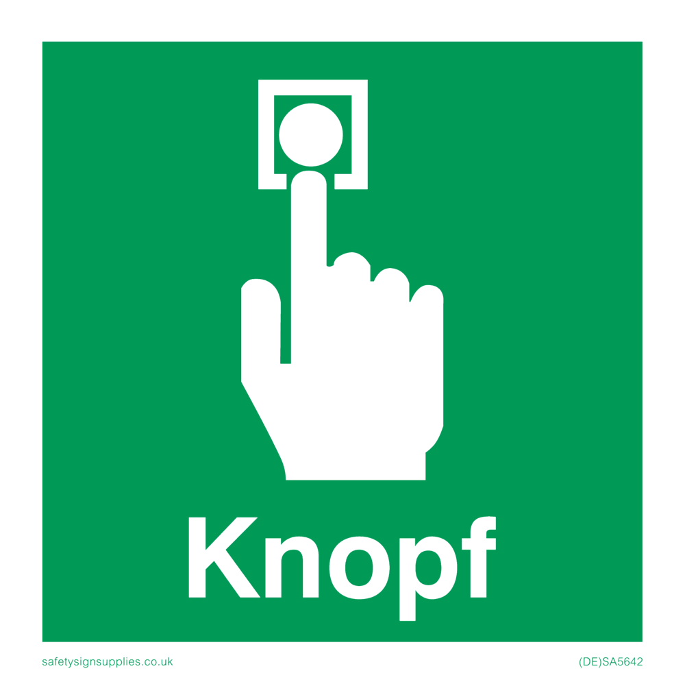This sign contains a push button / emergency stop symbol - hand pushing button in white on green background. Comes with a self adhesive backing. 200mm or approximately 8" high. 200mm or approximately 8" wide.