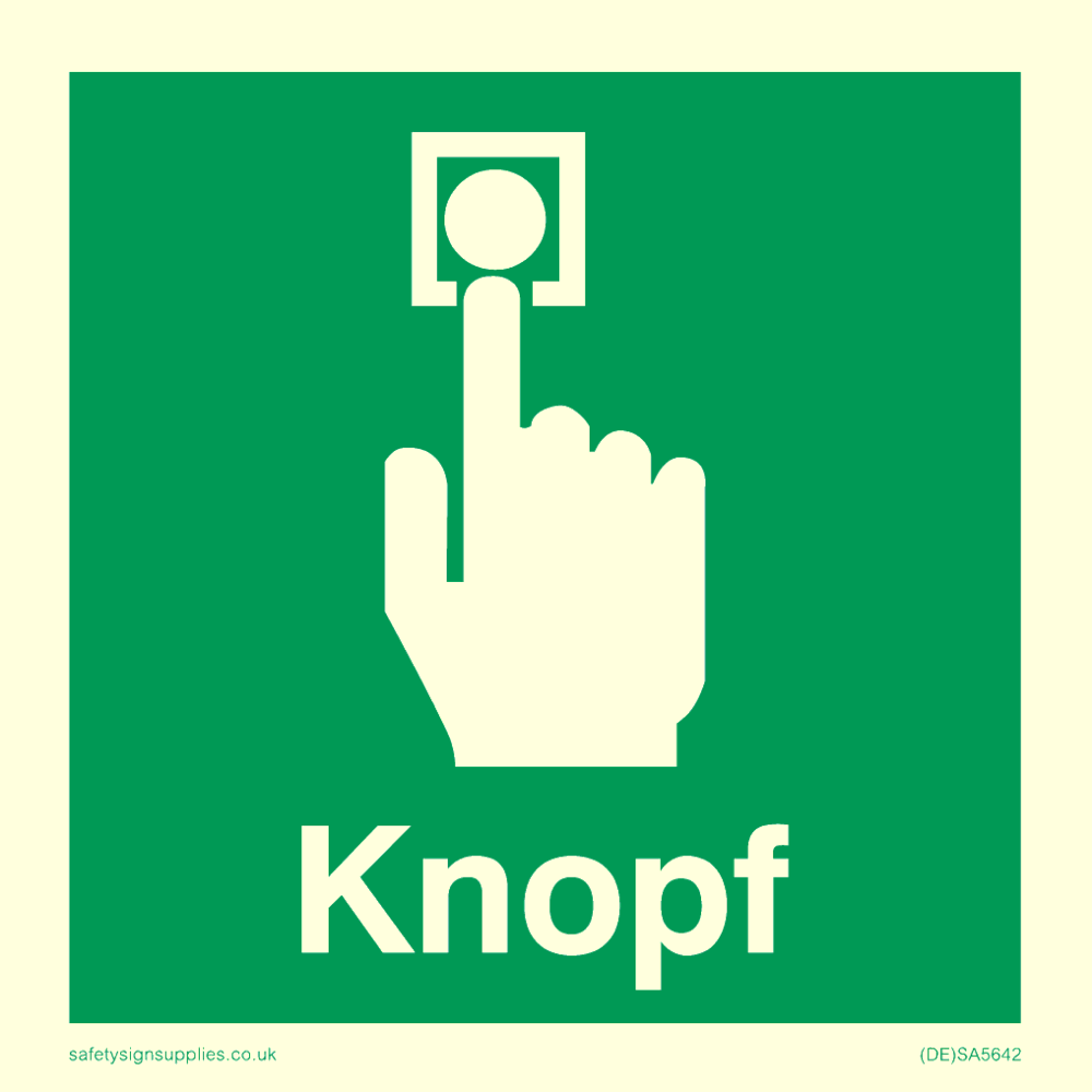 This sign contains a push button / emergency stop symbol - hand pushing button in white on green background. Comes with a self adhesive backing. 85mm or approximately 3.5" high. 85mm or approximately 3.5" wide.
