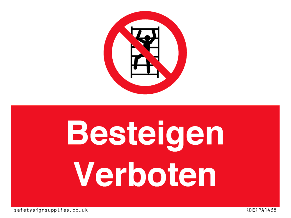 This sign contains a do not climb symbol. Man climbing racking within red circle with diagonal line crossed through.