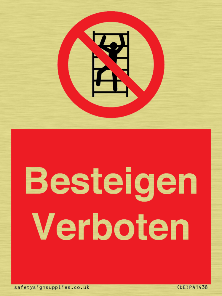 This sign contains a do not climb symbol. Man climbing racking within red circle with diagonal line crossed through.