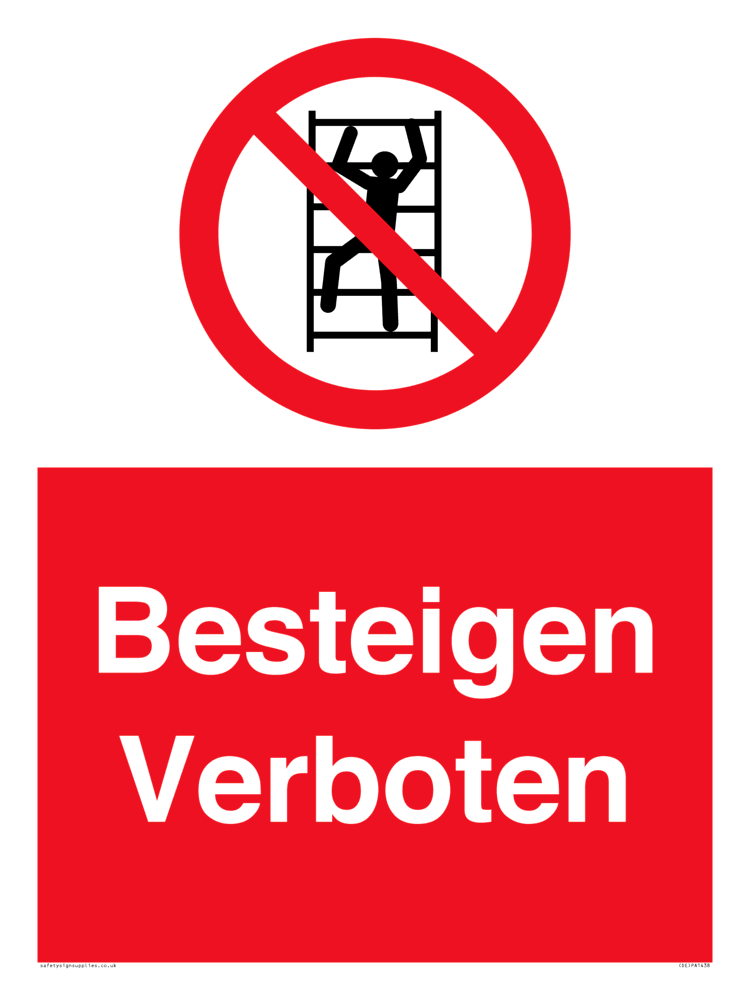 This sign contains a do not climb symbol. Man climbing racking within red circle with diagonal line crossed through.