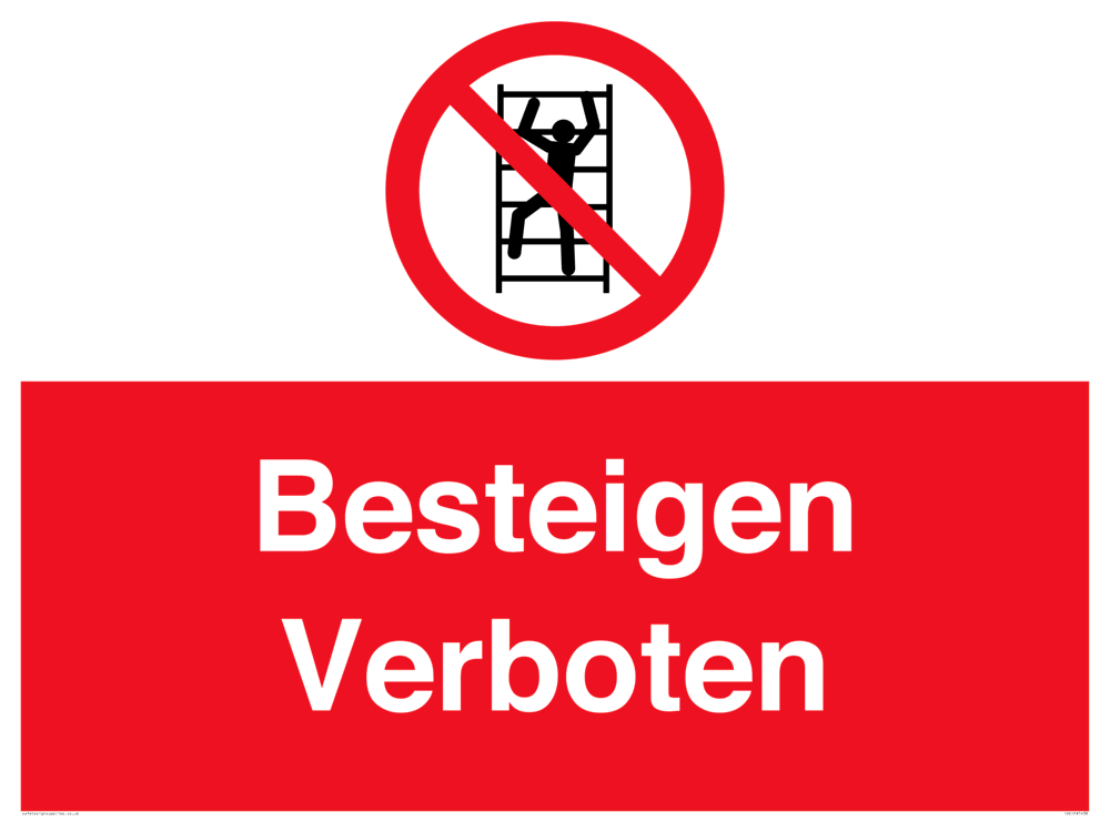This sign contains a do not climb symbol. Man climbing racking within red circle with diagonal line crossed through.