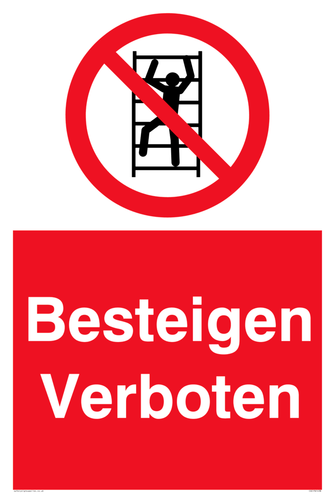 This sign contains a do not climb symbol. Man climbing racking within red circle with diagonal line crossed through.