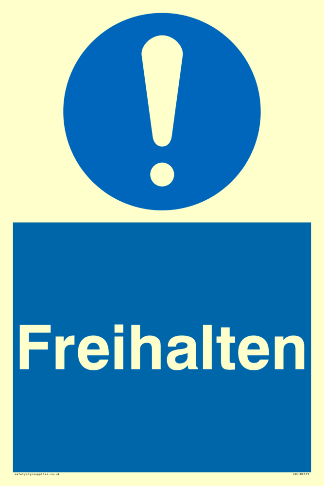 This sign contains a general Mandatory Exclamation Symbol - exclamation mark in white on blue circle background.