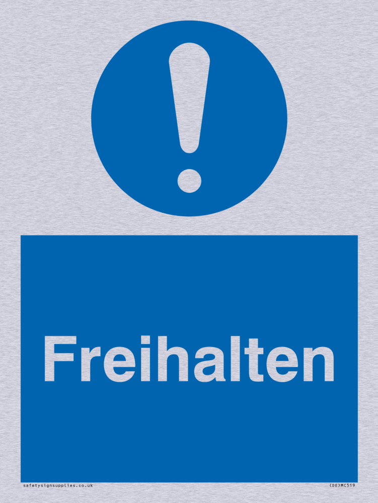 This sign contains a general Mandatory Exclamation Symbol - exclamation mark in white on blue circle background.