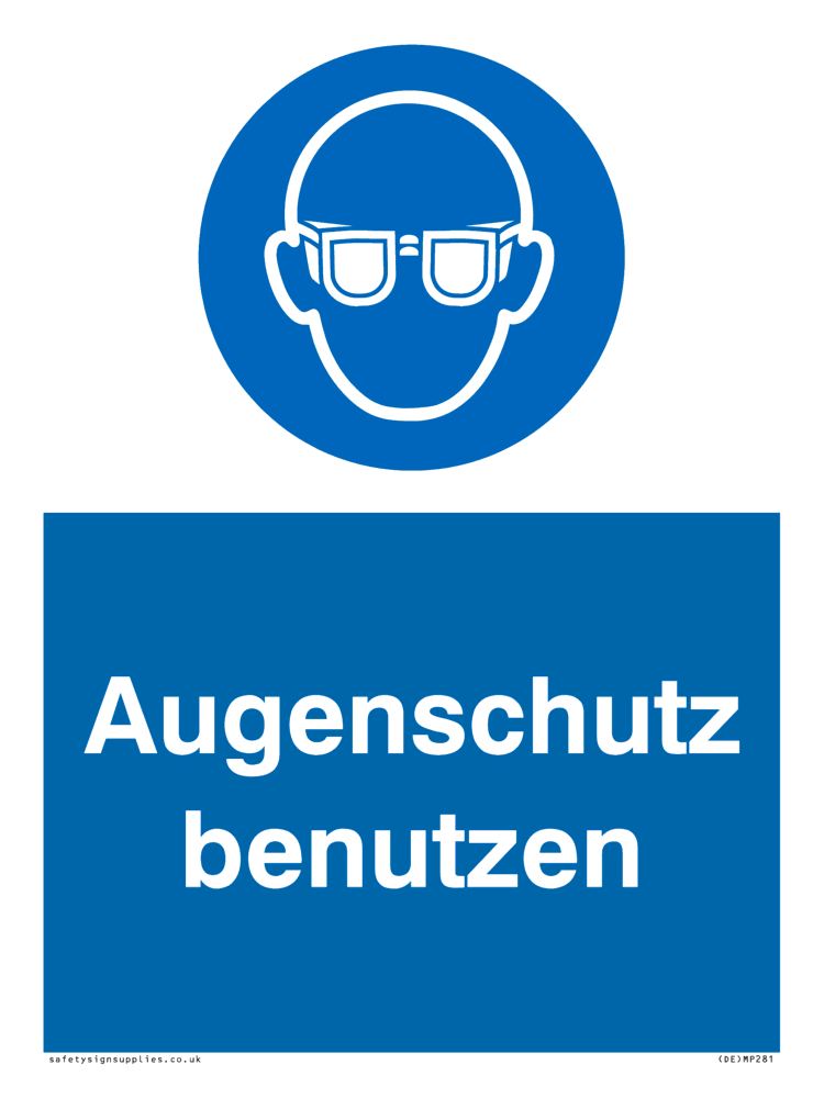 This sign contains an eye protection required symbol - person wearing safety glasses in white within blue circle. Comes with a self adhesive backing. 200mm or approximately 8" high.