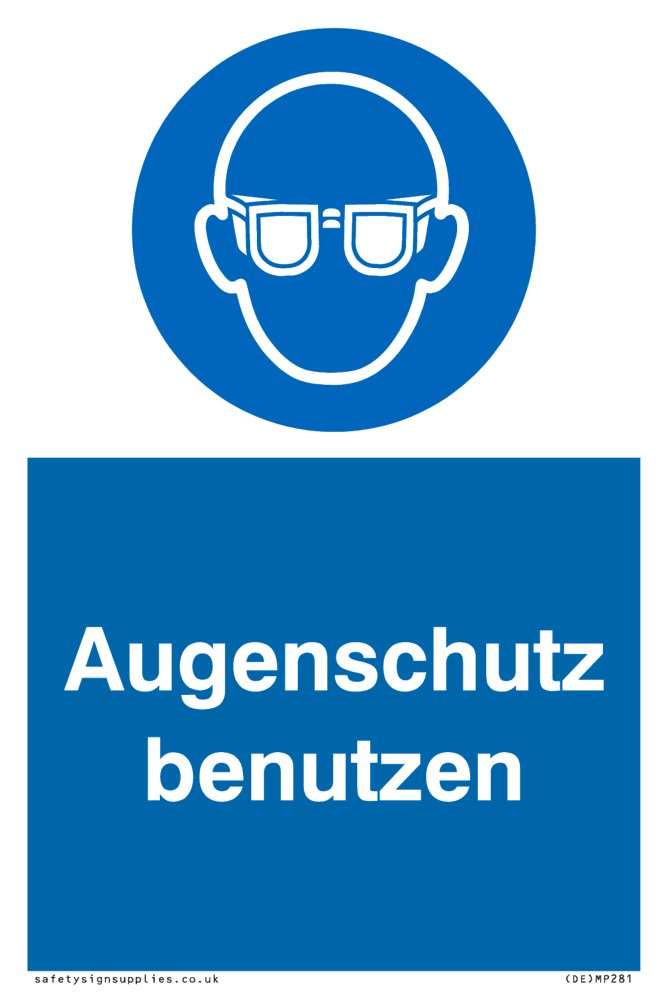 This sign contains an eye protection required symbol - person wearing safety glasses in white within blue circle.