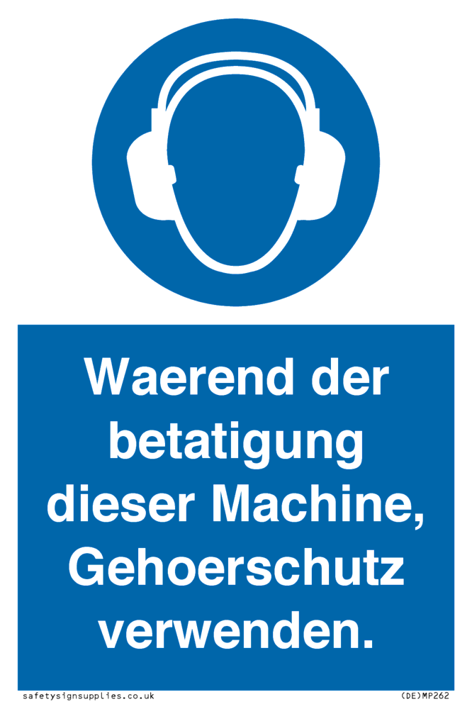 This sign contains an ear protection required symbol - person wearing ear defenders in white within blue circle.