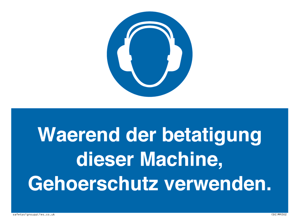 This sign contains an ear protection required symbol - person wearing ear defenders in white within blue circle.