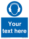 This sign contains an ear protection required symbol - person wearing ear defenders in white within blue circle.