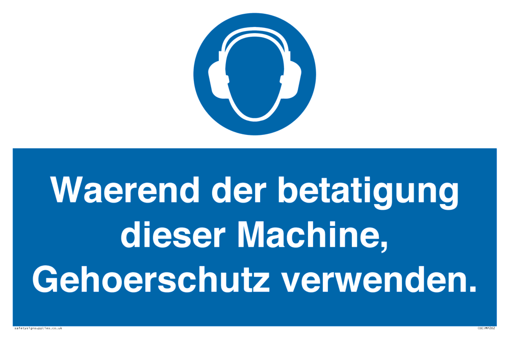 This sign contains an ear protection required symbol - person wearing ear defenders in white within blue circle.