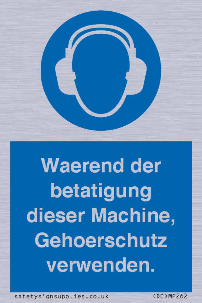 This sign contains an ear protection required symbol - person wearing ear defenders in white within blue circle.