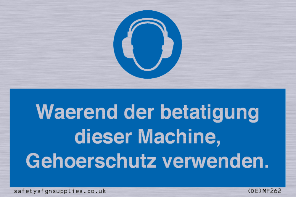 This sign contains an ear protection required symbol - person wearing ear defenders in white within blue circle.
