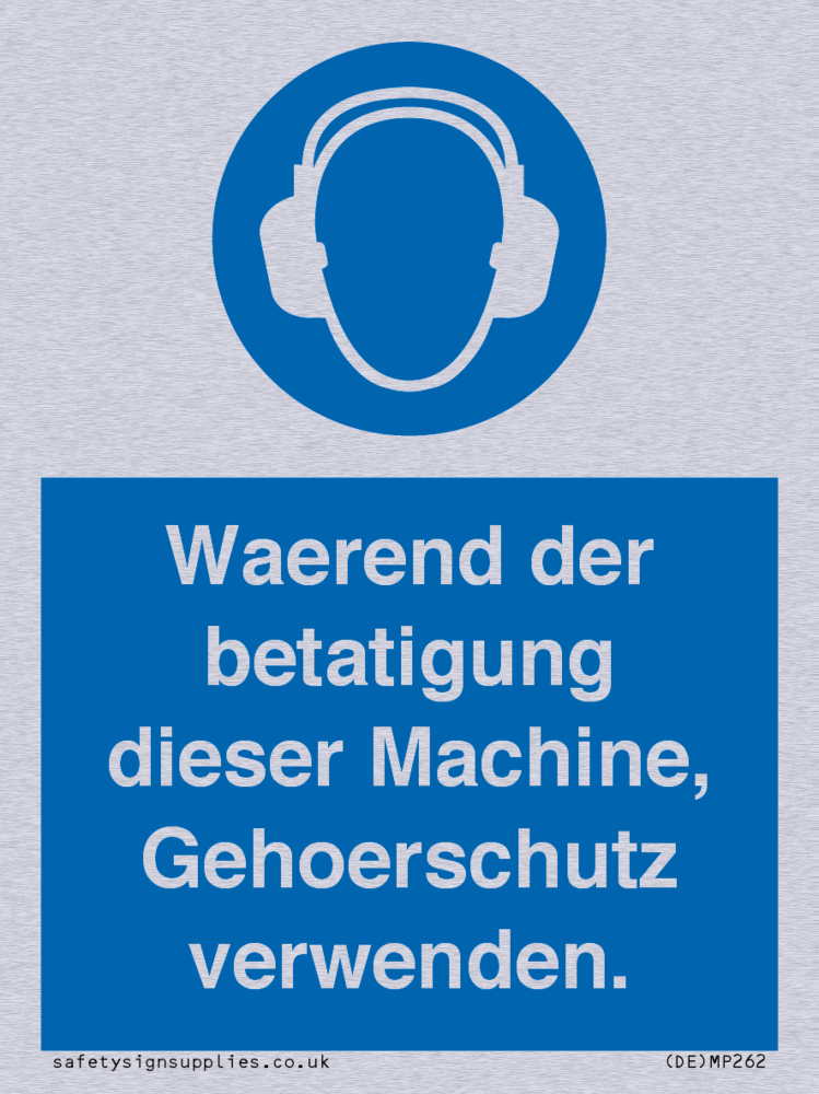 This sign contains an ear protection required symbol - person wearing ear defenders in white within blue circle.