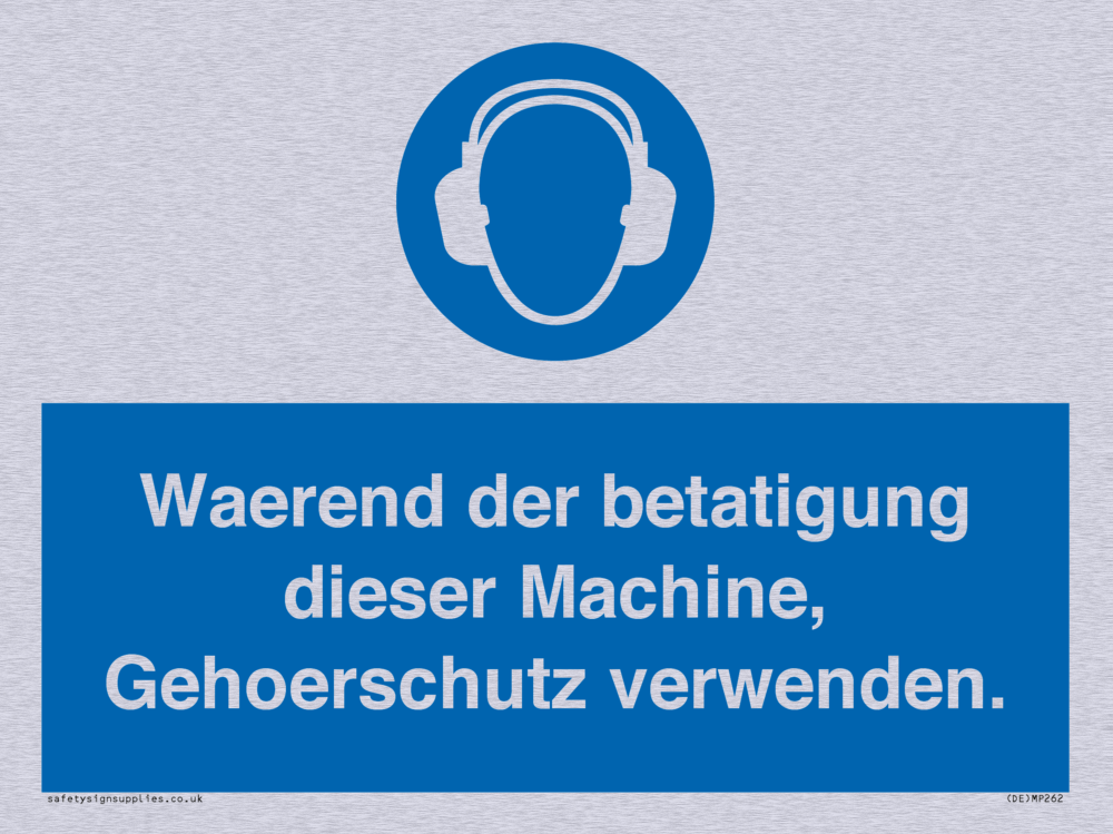 This sign contains an ear protection required symbol - person wearing ear defenders in white within blue circle.